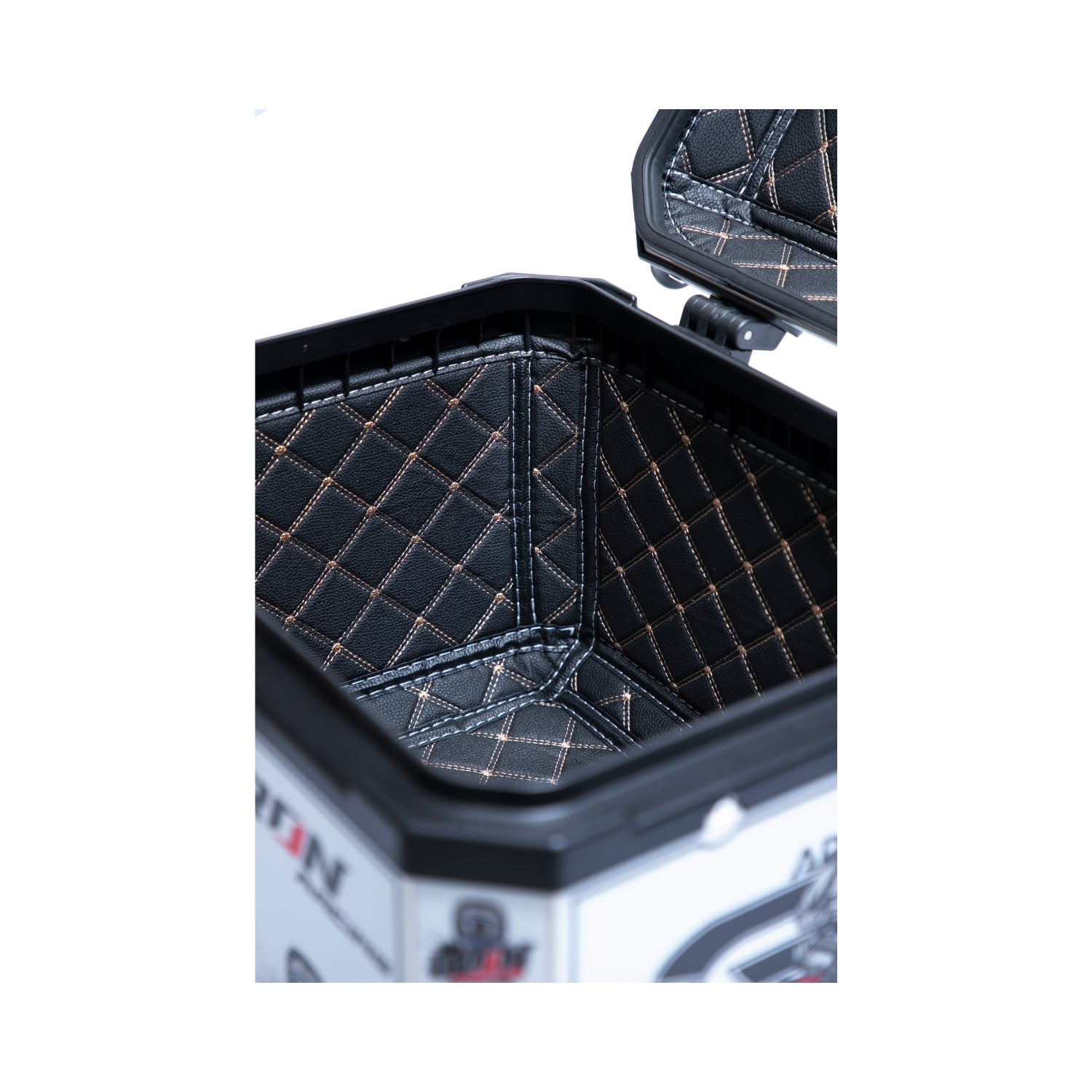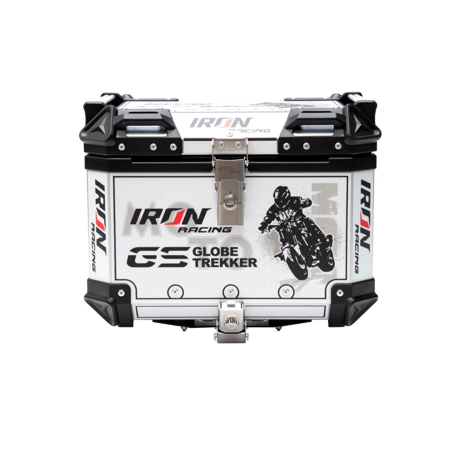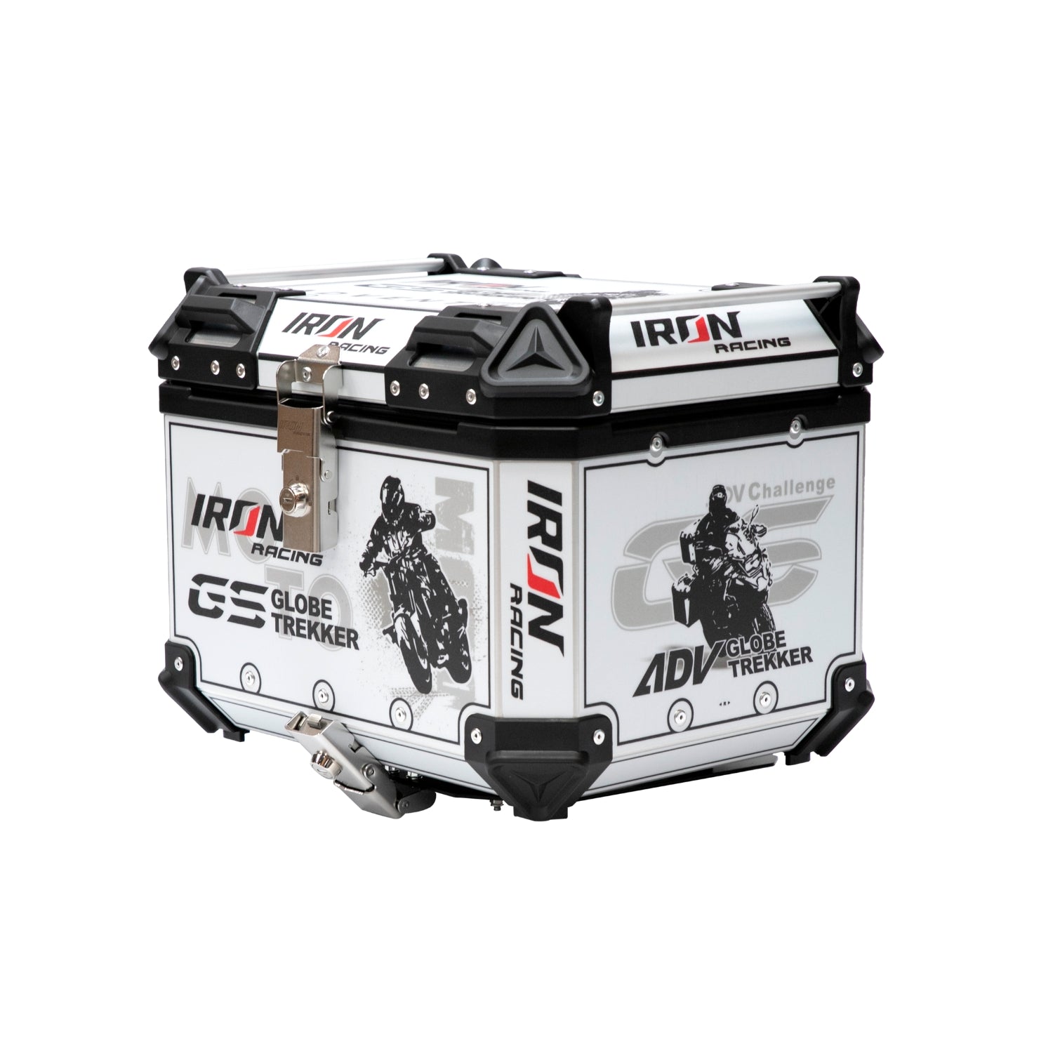 Con el maletero portaequipaje de lujo Cool Silver de 45 Litros de la marca Iron Racing tendrás la combinación de resistencia y lujo exclusivo para un motero aventurero, gracias a que se encuentra en su exterior fabricado en 100% aluminio reforzado altamente resistente a las diferentes condiciones climáticas, interior totalmente sellado se encuentra recubierto de cuero para proteger tu casco y prendas importantes.